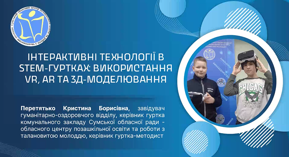У практичній частині заходу Кристина ПЕРЕТЯТЬКО, завідувач гуманітарно-оздоровчого відділу, керівник гуртка комунального закладу Сумської обласної ради обласного центру позашкільної освіти та роботи з талановитою молоддю, керівник гуртка-методист презентувала інтерактивні технології у STEM-гуртках, зокрема використання VR, AR та 3D-моделювання.