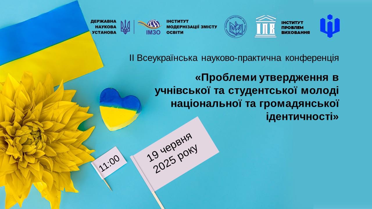19 червня 2025 р. об 11.00 відбудеться ІІ Всеукраїнська науково-практична конференція «Проблеми утвердження в учнівської та студентської молоді національної та громадянської ідентичності» (далі – Конференція).