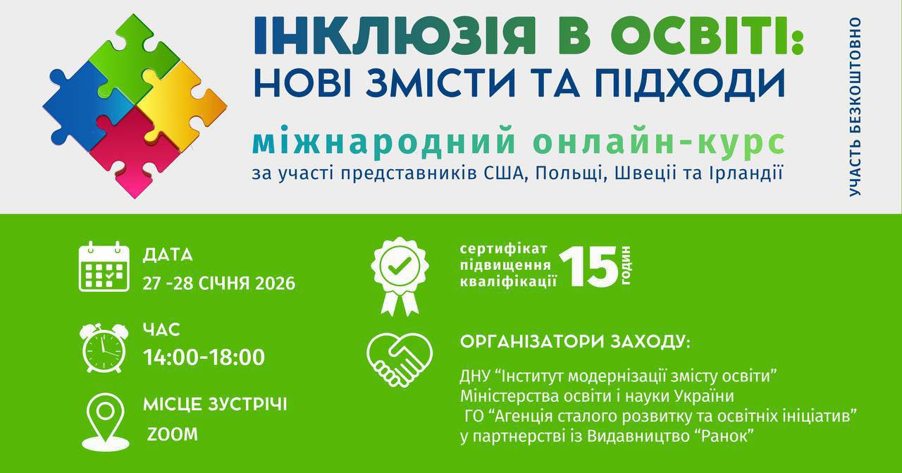 27–28 січня 2026 року відбудеться Міжнародний онлайн-курс “Інклюзія в освіті: нові змісти та підходи” (далі — Міжнародний курс).
