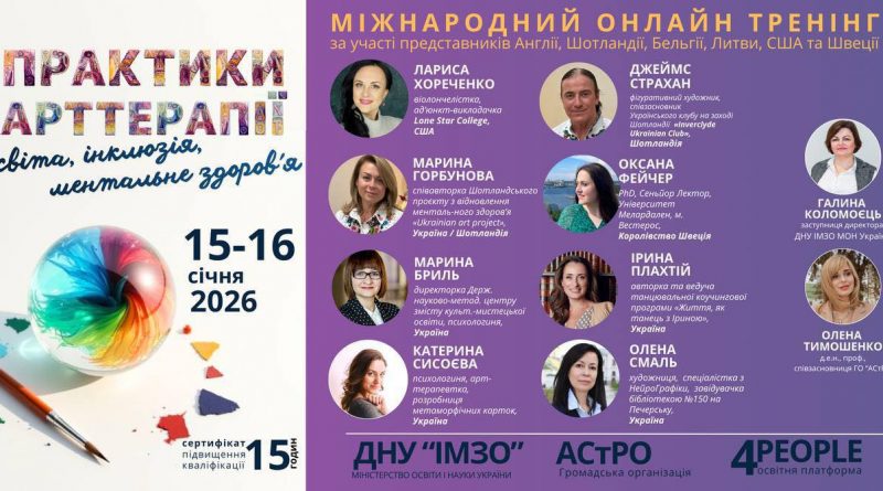 15-16 січня 2026 року відбудеться Міжнародний онлайн-тренінг «Практики арттерапії: освіта, інклюзія та ментальне здоров’я» за участі представників Англії, Шотландії, Бельгії, Литви, США та Швеції (далі Міжнародний тренінг).