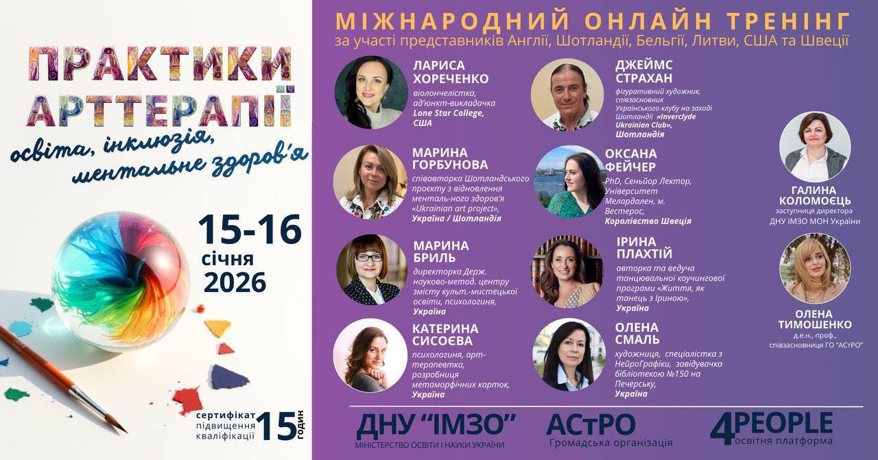 Для участі у Міжнародному онлайн-тренінгу «Практики арттерапії: освіта, інклюзія та ментальне здоров’я» за участі представників Англії, Шотландії, Бельгії, Литви, США та Швеції просимо зареєструватися до 14 січня 2026 року за покликанням: https://forms.gle/uCZ4nBDHZekddB1o8