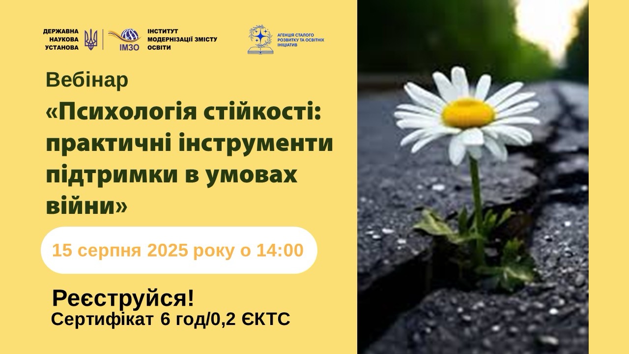 15 серпня 2025 року о 14.00 відбудеться вебінар «Психологія стійкості: практичні інструменти підтримки в умовах війни» (далі – Вебінар).