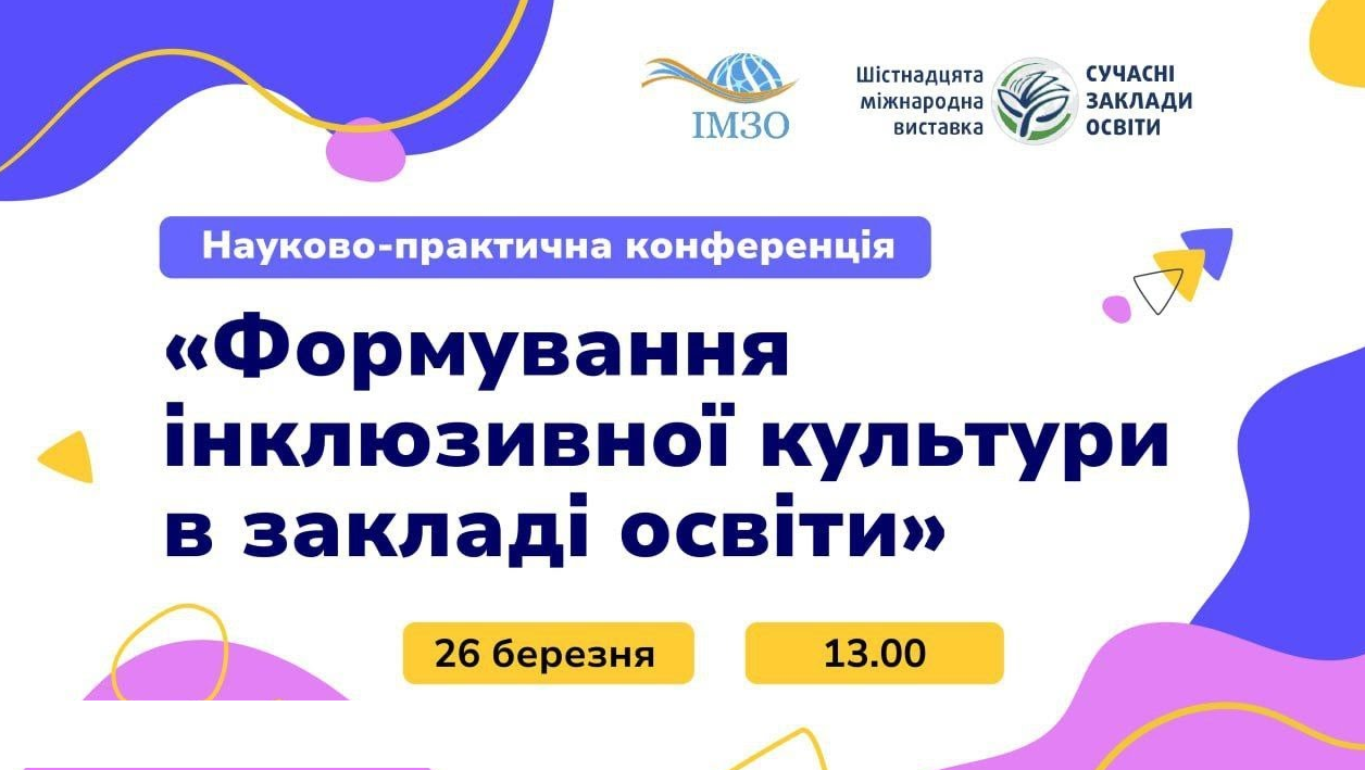 26 березня 2025 року о 13:00 в дистанційній формі відбудеться Всеукраїнська науково-практична конференція «Формування інклюзивної культури в закладі освіти» в межах Шістнадцятої міжнародної виставки «Сучасні заклади освіти».
