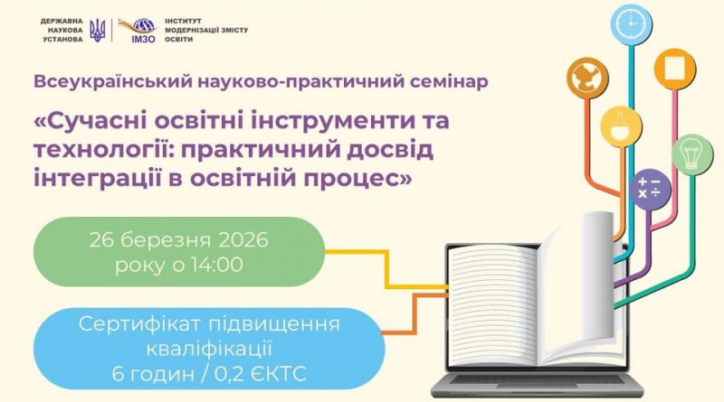 26 березня 2026 року в онлайновому режимі в рамках Сімнадцятої міжнародної виставки «Сучасні заклади освіти – 2026» відбудеться Всеукраїнський науково-практичний семінар «Сучасні освітні інструменти та технології: практичний досвід інтеграції в освітній процес».